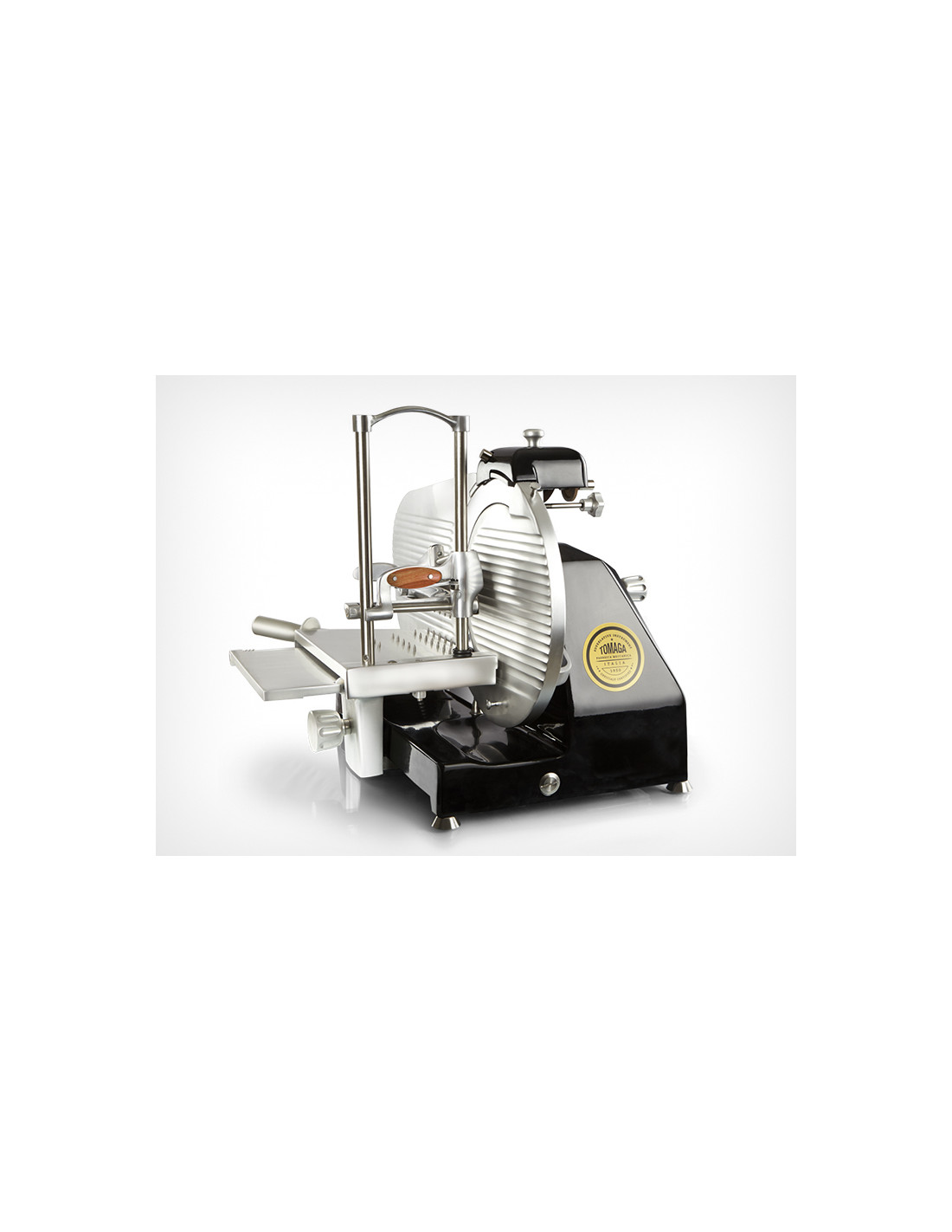 Lame verticale – Trancheuse à courroies rainurées dernière génération – personnalisation du bras comme sur les trancheuses mécaniques – éléments inox, vernies et décorées – poignées bois et blason en laiton). Facilité de nettoyage avec éléments amovibles et adaptés au lave-vaisselle. Qualité des matériaux. Pas d'élément plastique.